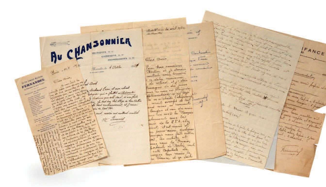 Portraits de Fernandel en costume de comique troupier, avec dédicaces a.s. à «Domino» et sa femme, «en souvenir d'une solide amitié», 1927-1929... Cartes postales de divers lieux de séjour en France et à l'étranger, 1928-1935: «je vais commencer la cinquième représentation, le succès continue et le monde aussi, à la soirée d'hier on est arrivé à près de 10000 de recette» (Toulouse 2 sept. 1928) | «Mon succès à Bobino a été très grand et mes débuts à Paris sont plus que satisfaisants [...] je suis content car on commence à parler de moi et ça me fait augurer un bel avenir» (Paris 10 déc. 1928)... Liste sommaire de décors et meubles nécessaires pour un spectacle aux «Amis de l'enfance de la Belle-de-Mai» à Marseille. Lettres amicales, exprimant de la nostalgie de sa ville natale, et le souhait de revenir «gouter aux charmes des beaux jours et de la pêche à la ligne sur les rochers de la Batterie d'Endoume [...] en oubliant complètement les chansons, la musique et les applaudissements que l'on ne me ménage pas» (13 mars 1929)... Il charge Vena de faire ou de surveiller divers travaux d'électricité, et se réjouit de la perspective de passer deux mois complets à Marseille, l'hiver de 1932-1933 : «j'ai signé la revue des Variétés» (14 août 1932)... Menu du banquet pour ses 10 ans de mariage, recouvert de dédicaces de Fernandel et d'autres convives, 1935... Marseille 7 octobre 1936, brouille: «J'ai une quantité d'amis du temps où je n'étais pas ce que je suis, je suis resté malgré ma montée artistique celui qu'ils ont toujours connu, et je m'honore de leur amitié. Vois-tu dans la vie il y a des hauts et des bas, tu dis que notre rang n'est pas le même et que peut-être plus tard nous nous retrouverons, je ne t'ai pas interdit ma maison, c'est toi qui l'as quittée. [...] Je t'ai toujours considéré comme un ami, un vrai et tu as de ton propre chef perdu cette amitié»...