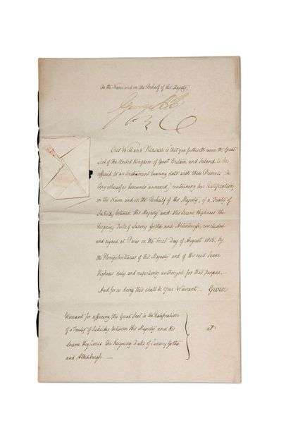 Mandat du Prince Régent, au nom du Roi, pour mettre le Grand Sceau du Royaume Uni de Grande-Bretagne et Irlande, à la ratification, au nom de Sa Majesté, d'un traité de subside entre Sa Majesté et le Duc régnant de SAXE-GOTHA et Altenbourg, conclu et signé à Paris le 1er août 1815 par les plénipotentiaires le duc de Wellington et le baron de Gersdorff.