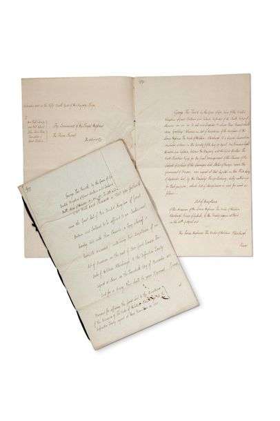 On joint le mandat contresigné par le ministre du Foreign Office, le vicomte CASTELREAGH, Carlton Palace 30 décembre 1820 (la signature du roi George IV a été découpée avec perte de quelques mots | cahier in-fol. de 5 pages, lié d'un ruban de soie bleue | en anglais et en français), pour mettre le Grand Sceau du Royaume Uni de Grande-Bretagne et Irlande, à l'acceptation de l'acte d'adhésion par le Duc de HOLSTEIN-OLDENBURG du Traité définitif signé à Paris le 20 novembre 1818 (avec copie de l'acceptation et de l'acte d'adhésion par le baron de Matzahn annexée).
