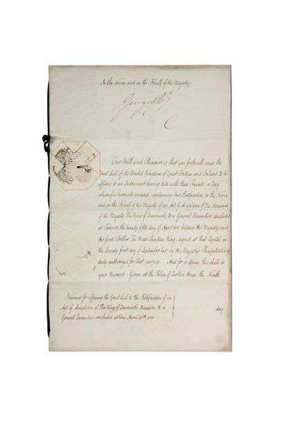 P.S. «George PR» (en tête), Palace of Carlton House [Londres] 18 décembre 1818 | contresignée par le secrétaire d'État à la Guerre et aux Colonies, le comte BATHURST | cahier in-fol. de 8 pages, lié d'un ruban de soie noire, sceau aux armes sous papier en tête | en anglais.