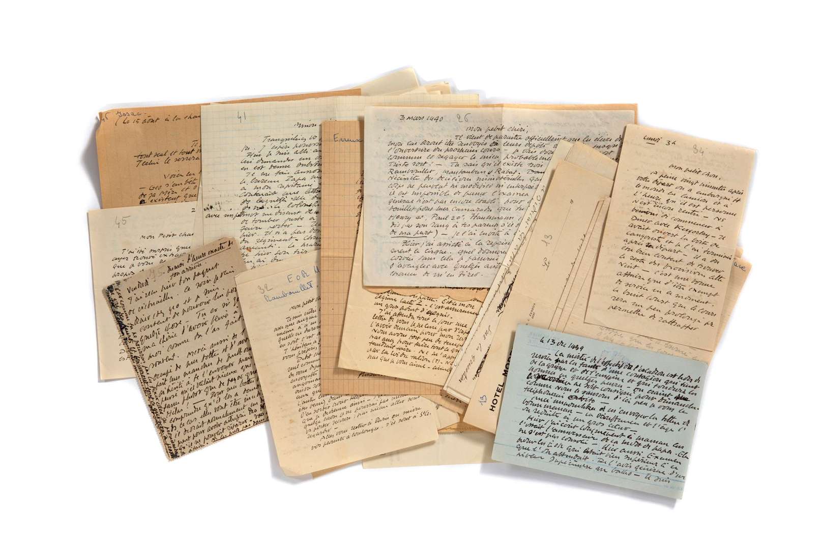 On joint un ensemble d'archives : un ordre de mission militaire signé du Lt-Colonel de Padirac (juillet 1940), un laissez-passer (juillet 1941) | une centaine de lettres (de sa femme Michelle, famille, amis) à lui adressées, des notes autographes d'Octave Simon sur ses travaux de sculpture, des papiers administratifs etc. | une cinquantaine de photos de famille de ses dernières années (lui, sa femme, sa fille...) | une médaille en bronze (4 cm) gravée à son nom en souvenir d'examens d'équitation à Paris en 1931 | 2 rosettes de Légion d'Honneur (boutons de veste) et une empreinte ancienne d'armoiries sur cire rouge.
