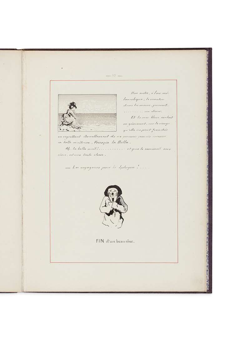 Manuscrit autographe calligraphié à l'encre brune, avec le titre et soustitre à la gouache brique, bordé d'un filet d'encadrement rouge à toutes les pages. Il est dédié à Madame QUILLIARD comme l'«hommage d'un beau rêve... réalisé».