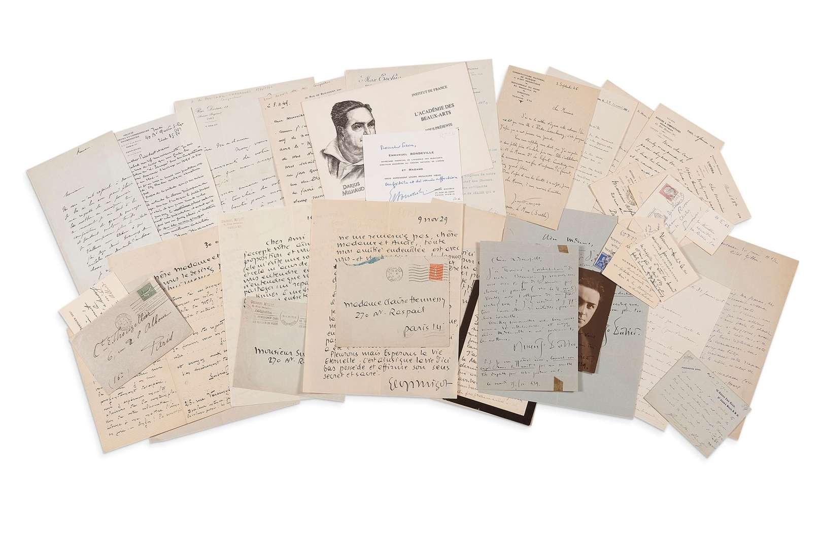 Louis BEYDTS (à René Dumesnil), Emmanuel BONDEVILLE (plus une carte de vœux de l'Institut de France avec portrait gravé de Darius Milhaud par Decaris), Gustave CHARPENTIER (3 cartes de visite autogr), Vincenzo DAVICO (2, plus une photo dédicacée), Jean FRANCAIX (3 comme directeur du Conservatoire du Mans), Gabriel GROVLEZ, Hamilton HARTY, Henri HIRCHMANN, Charles LEVADÉ (au sujet de vers qu'il ne peut mettre en musique), André MESSAGER (2, une à Alfred Mortier), Georges MIGOT (5, à Swan Hennessy et à sa veuve), Armande de POLIGNAC-CHABANNES, Henri RABAUD (à Ninon Massenet, au sujet du monument Massenet, 1925).
