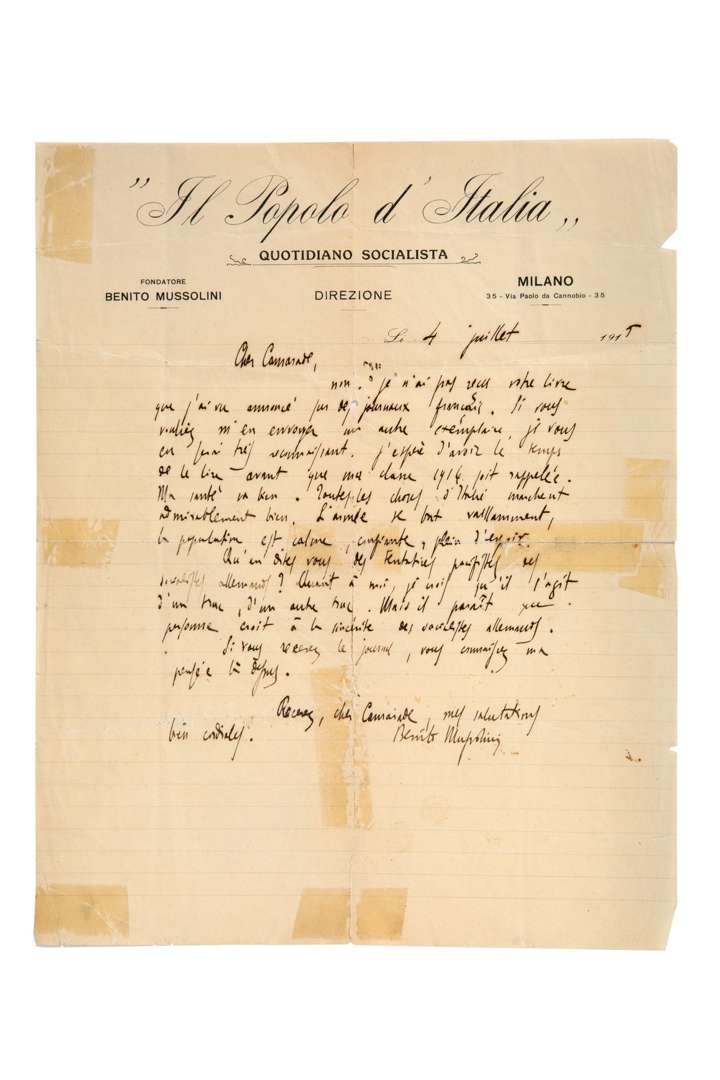 L.A.S. «Benito Mussolini», Milano 4 juillet 1915, à un «cher Camarade» | ¾ page in-4 à en-tête Il Popolo d'Italia (fentes réparées au scotch) | en français.