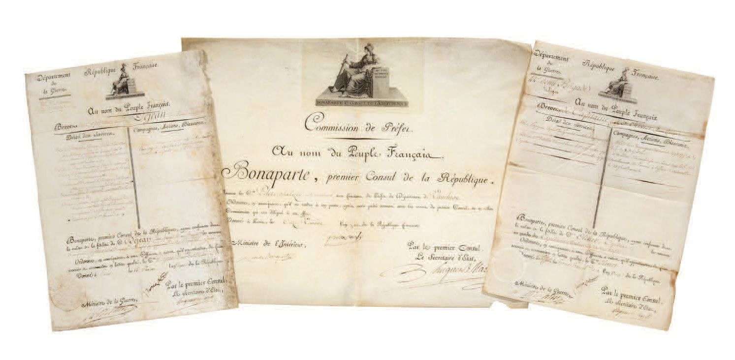 On joint 2 autres P.S. «Bonaparte» (secrétaire), contresignées par Alexandre Berthier, ministre de la Guerre et Hugues B. Maret, secrétaire d'État : brevets de capitaine à la 44e demi-brigade de ligne et le 20e régiment de dragons pour Pierre-François Olivier et Pierre-François-Marie-Auguste Dejean, avec détail de leurs services, campagnes, actions et blessures (vélins in-fol. en partie impr., en-têtes Département de la Guerre, vignettes, sceaux sous papier). Plus une notice biographique impr., une gravure du général Rampon, et une plaquette, Constitution de l'Empire français, présentée à l'acceptation du peuple (Dijon, Victor Lagier, 26 avril 1815).