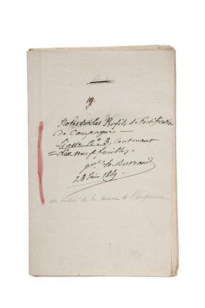 au crayon (2 à l'encre | filigranes Iping 1813, Stacey Wise 1818, C R 1815, Golding & Snelgrove 1815, W 1815, T Edmonds 1816, et la «Britannia»), lié par un ruban de soie rose scellé d'un cachet de cire rouge aux armes du comte Bertrand [«Liasse n° 3»] | sous emboîtage maroquin rouge.