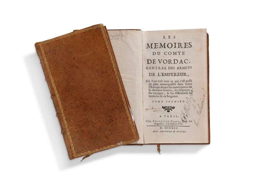 Les Mémoires du comte de Vordac, général des armées de l'empereur. Paris, Charles Le Clerc, 1730. 2 volumes in-12, veau fauve moucheté, roulette en encadrement, dos orné avec pièces verte et rouge, chiffre PB en queue du dos, tranches jaunes, étui moderne à dos de maroquin rouge (Reliure attribuable à Bizouard).