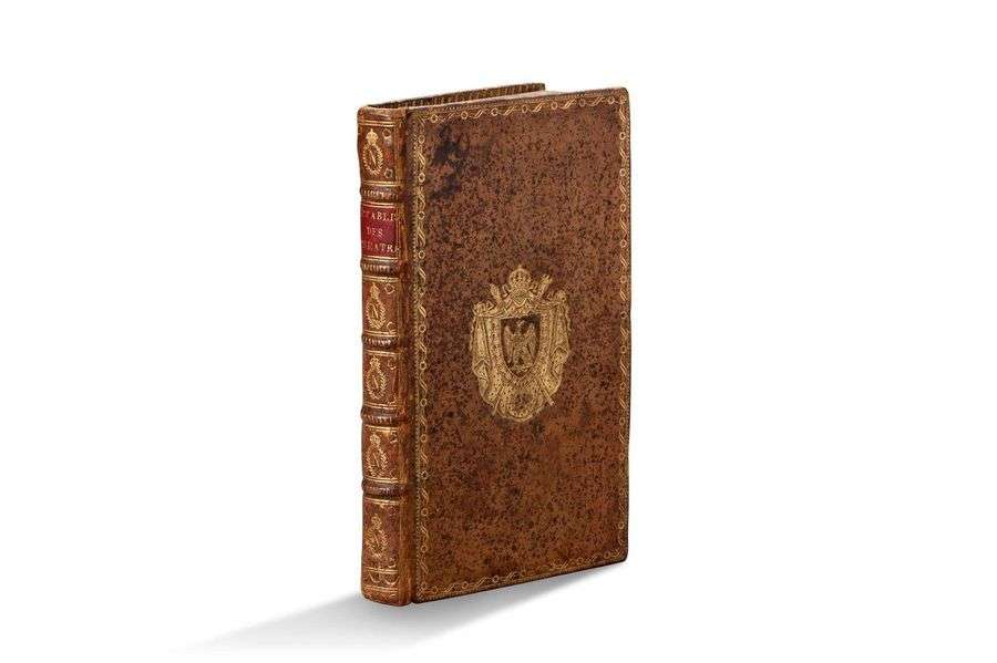 Histoire de l'établissement des théâtres en France. Paris, Fréchet, 1807. In-12, veau fauve moucheté, roulette en encadrement, armes sur les plats, dos orné du chiffres N couronné répété, tranches marbrées, étui moderne à dos de maroquin rouge (Reliure de l'époque).