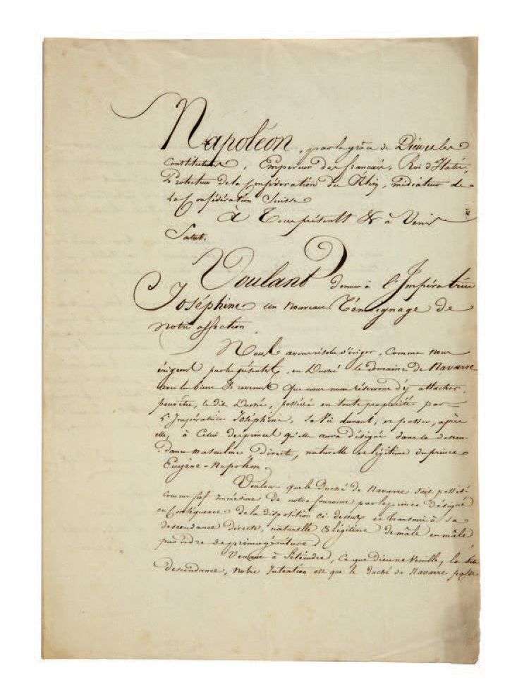 Lettres patentes provisoires érigeant le domaine en duché le 11 mars 1810 (copie). Correspondances par le baron Darnay, intendant général de la maison ducale de Leuchtenberg à Paris | Caillot et La Porte, régisseurs du domaine | Charles-Michel-Élie Fouché, receveur des revenus du duché | Bernard Delaitre, préfet de l'Eure | le vicomtesse de Vergnette (suppliques à Eugène de Beauharnais, dont une avec apostille a.s. du prince), etc. Mémoires, quittances, comptes et états récapitulatifs de dépenses du domaine (personnel, contributions, travaux de menuiserie, vitrerie, plomberie, couverture, reconstruction d'un pont, coupe de bois etc. | dépenses extraordinaires pour des gratifications, voyages, consultations, frais de procédure) et recettes (revenu de Malmaison, fermages, loyers)... Affiche d'une vente aux enchères Duché de Navarre. Coupe de bois pour l'ordinaire 1825.