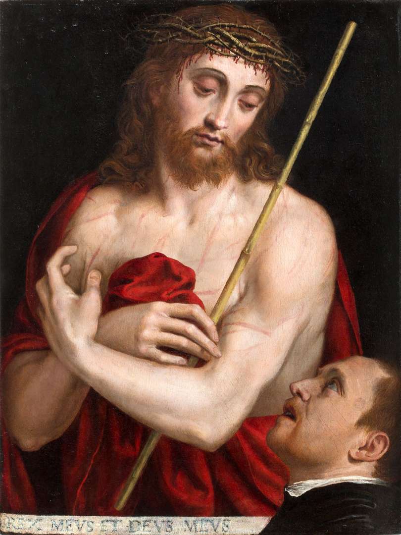 L'image est singulière. Un Christ aux liens monumental, le regard tourné vers le bas, croise celui d'un Jésuite dont la tête fait irruption dans l'angle inférieur droit. Néanmoins, il semblerait que l'inscription Rex Meus et Deux Meus place ce personnage dans le monde réel, tandis que le divin n'est que représentation picturale, assortie de son titre. Cette impression tend à se renforcer d'autant plus que le Christ est une référence directe à Giampietrino (1495-1521). Imperceptiblement pourtant, la figure divine s'anime, ses bras recroquevillés semblent s'ouvrir doucement, rompant la sculpturalité de l'Ecce Homo et fait basculer la scène dans une vision d'extase. Le choix de la représentation du Jésuite, où seule la tête apparaît, bordée sobrement de son col blanc et du haut de son habit noir, les yeux levés, la bouche bée, les dents apparentes tendent à imposer cet aspect extatique.