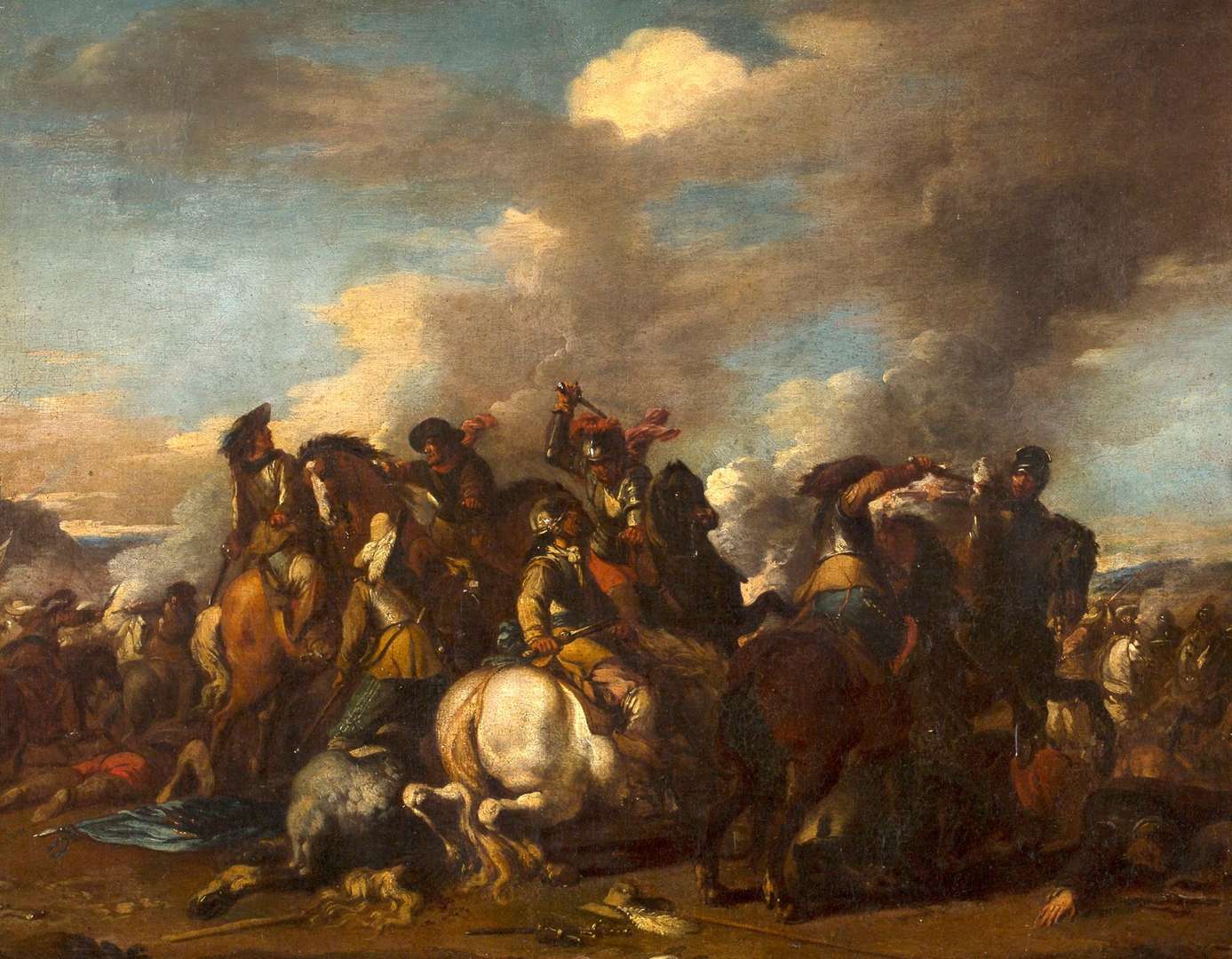 Ancienne collection Boucairan (Nîmes) | Collection du comte de Flaux. «Parmi les peintres de cette époque en Europe, personne n'a égalé Courtois dans l'expression de l'horreur de la bataille», ainsi est décrit notre artiste par le Bernin. Ce tableau saisissant montre le choc brutal de cavaliers ennemis tandis qu'autour d'eux, le combat fait rage. Des nuages de fumée s'élèvent derrière les cavaliers, mêlés à la poussière soulevée par leurs chevaux. C'est tout le génie de Jacques Courtois dans l'évocation du combat que l'on retrouve à l'oeuvre ici.