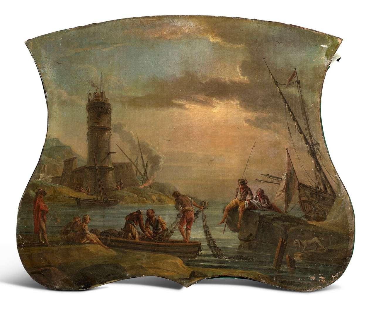 Ensemble de six dessus de porte aux bords chantournés représentant des scènes de port