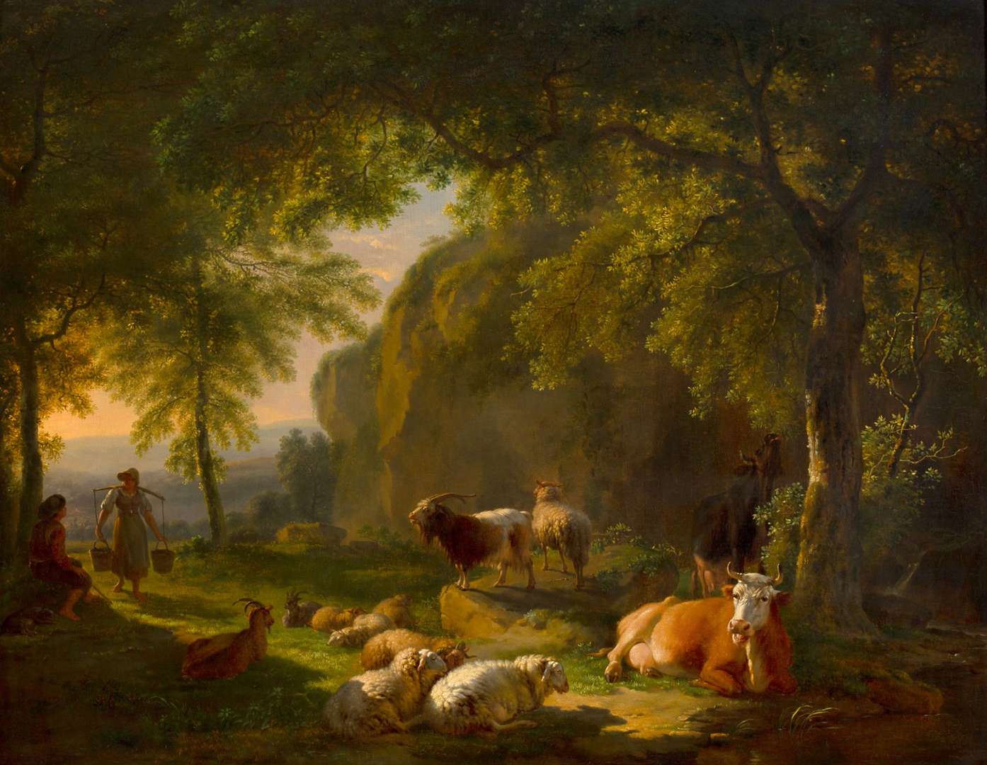 Une lumière chaude filtre entre les arbres d'une vallée idéale, où chèvres, vaches et moutons se mêlent sous la surveillance alanguie de pâtres. On doit cette figuration idyllique d'un après-midi d'été à un grand paysagiste oublié, Baltasar-Paul Ommeganck.