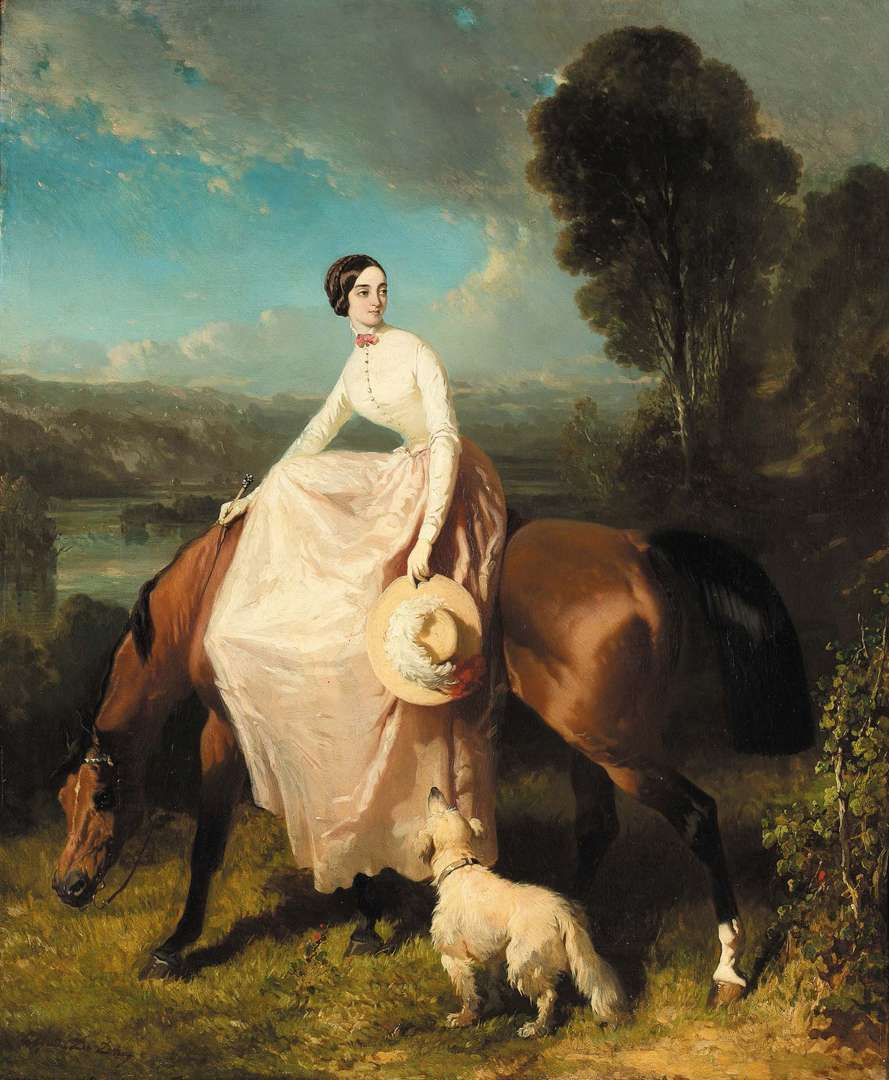 Les amazones occupent une place singulière dans le corpus du peintre, au faîte de cette production particulière dès le début des années 1840. Depuis la Révolution, le portrait s'est démocratisé au sein d'une bourgeoisie pour qui il devient signe d'une certaine reconnaissance sociale. Dans le même temps, le portrait équestre reste l'apanage de la haute-société dont le défilé se fait incessant auprès du peintre. L'atelier se mue en une véritable nébuleuse d'aristocrates venus de l'Europe entière parmi lesquels se retrouvent les grands noms de la vénerie française ou les habitués des derbies d'Epsom et de Longchamp qui s'empressent chacun, de commander leur portrait. Sous le pinceau de De Dreux naît une foule de cavaliers et cavalières aux silhouettes fines et élancées, dont la noblesse de l'allure fait écho à la beauté de leur monture. Des pur-sang pour la plupart, Alfred De Dreux contribue au succès de la race dont il s'attache à restituer dans le même temps le soyeux des robes et des crinières, mais aussi la tension, la nervosité et la musculature des chevaux magnifiés. Plus qu'éléments de composition, ils sont symboles de luxe et d'appartenance aux hautes sphères de la société. Comble de l'accessoire mondain, le peintre accompagne souvent ces duos d'un petit chien, compagnon d'ennui ou de chasse des jeunes gens.