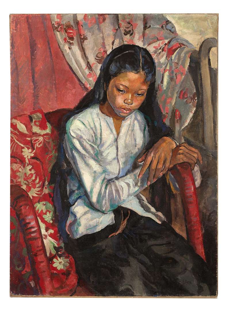 Bien qu’Alix Aymé ait été mandatée par le gouvernement français pour réaliser des peintures destinées à orner le pavillon du Laos lors de l’Exposition Universelle de 1931, l’artiste n’a cessé de travailler au sein de son studio pour saisir l’essence indochinoise l’entourant. Travailleuse, passionnée et curieuse, elle s’est attachée à immortaliser les personnages l’entourant. Si Portrait de Thi Ba, se démarque des productions classiques, il reprend tous les codes propres aux oeuvres de composition où l’attention est portée à chaque détail. Ainsi, la jeune fille assise de trois-quarts a la tête légèrement baissée, les yeux inclinés vers le bas, pensive. Ses mains, belles et fines, sont sagement posées l’une sur l’autre, attendant de pouvoir bouger. L’attitude timide et dictée du modèle rappelle l’innocence de son âge. Loin des modèles nus alanguis quelque peu sensuels, la tenue sobre de cette ravissante jeune fille a une candeur touchante. Toute en simplicité, vêtue d’une chemise blanche à la coupe ajustée, les cheveux longs détachés elle incarne la douceur de l’enfance, dénuée de superficialité. La construction du décor rappelle l’étude approfondie de la composition voulue par l’artiste. Une tenture est négligemment jetée sur la droite, rejoignant sur le côté gauche un rideau, jouant ainsi des contrastes de matières et des mouvements. Seul un fauteuil vient compléter ce décor, assurant une lecture simplifiée. Ancienne élève de Maurice Denis, Alix Aymé adopte une palette nabi où les couleurs éclosent joyeusement tout en conservant une certaine harmonie. Le rouge carmin, le rose pêche et le vert d’eau des tentures se mêlent au blanc cassé de la chemise faisant délicatement ressortir le noir du pantalon mais aussi de la chevelure aux reflets bleu nuit. Grâce à une gamme chromatique chatoyante aux reflets habiles, mais aussi à un modèle à la douceur désarmante, Alix Aymé immortalise sa vision d’une Indochine qui lui fera dire « L’impression générale que l’on a du Laos n’est certes pas celle d’un pays riche, mais d’un pays simple et heureux ».