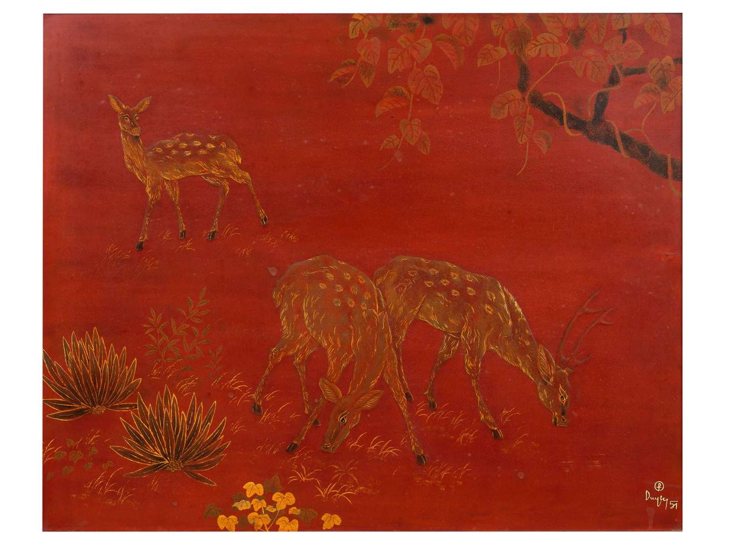Laque avec rehauts d'or, signée et datée en bas à gauche, marquée du cachet au dos