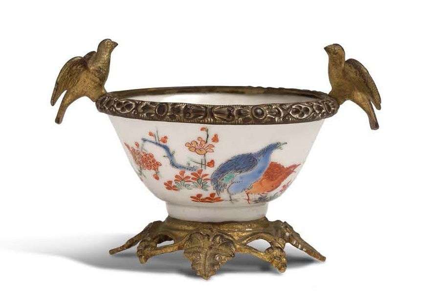Petite coupe en porcelaine de kakiemon sur monture en bronze ciselé et bordée d'un cercle en bronze avec deux oiseaux aux ailes déployées.