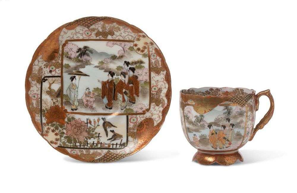 Tasse et sa soucoupe en porcelaine de Kutani, de type dit «coquille d'oeuf», à décor polychrome et or de jeunes femmes en promenade et d'oiseaux et pivoines, dans des cartouches sur fond de rinceaux et fleurs de paulownia, les pourtours ornés de motifs de brocart.