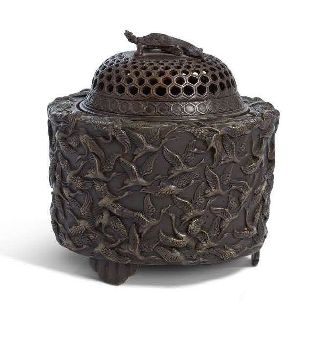 Brûle-parfum en bronze de patine brune, à décor en relief d'une colonie de grues en vol, le couvercle surmonté d'une tortue minogame.