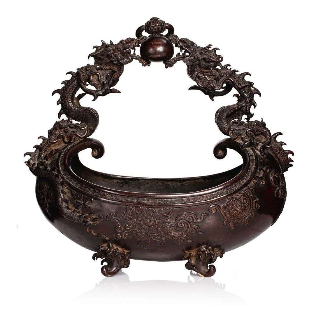 Corbeille en bronze de patine brun-rouge, évoquant une barque aux extrémités recourbées se prolongeant par des anses mouvementées figurant deux dragons affrontés de part et d'autre de la perle sacrée, quatre pieds en forme de vagues portant la paroi au décor floral et stylisé en léger relief.