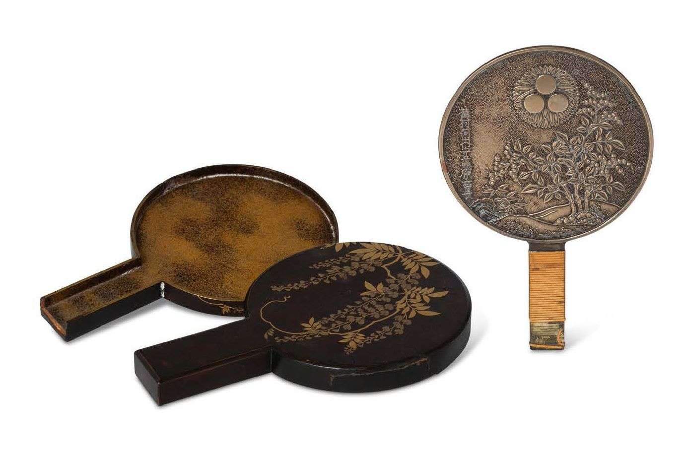 Petit miroir à main en alliage de cuivre, une face ornée en léger relief d'un arbuste et de bambous. Signé Uemura Kawachi no kami Fujiwara Yoshinaga.