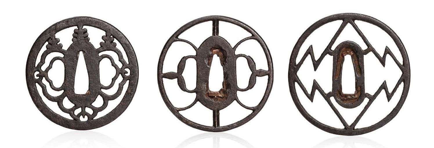 Trois sukashi tsuba en fer, l'une à décor de paulownias stylisés, les deux autres à décor symétrique de motifs géométriques.