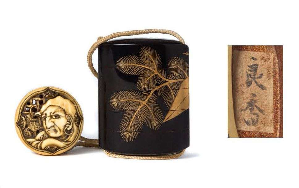 Inrô à quatre case en laque ro-iro à décor en takamaki-e de pousses de pins et d'une grue en origami, le netsuke de type ryusa-manju en ivoire, orné d'une tête de Daruma sur une face, un chasse-mouches et un sceptre au revers.