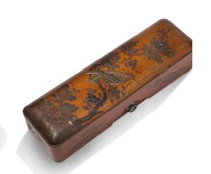 Fumibako en laque nashiji, le couvercle orné en iro-e takamaki-e d'un oiseau perché sur un cerisier en fleurs, auprès d'un buisson de chrysanthèmes | les côtés du couvercle à décor de fleurs, ceux de la boîte à décor de feuilles d'érable.