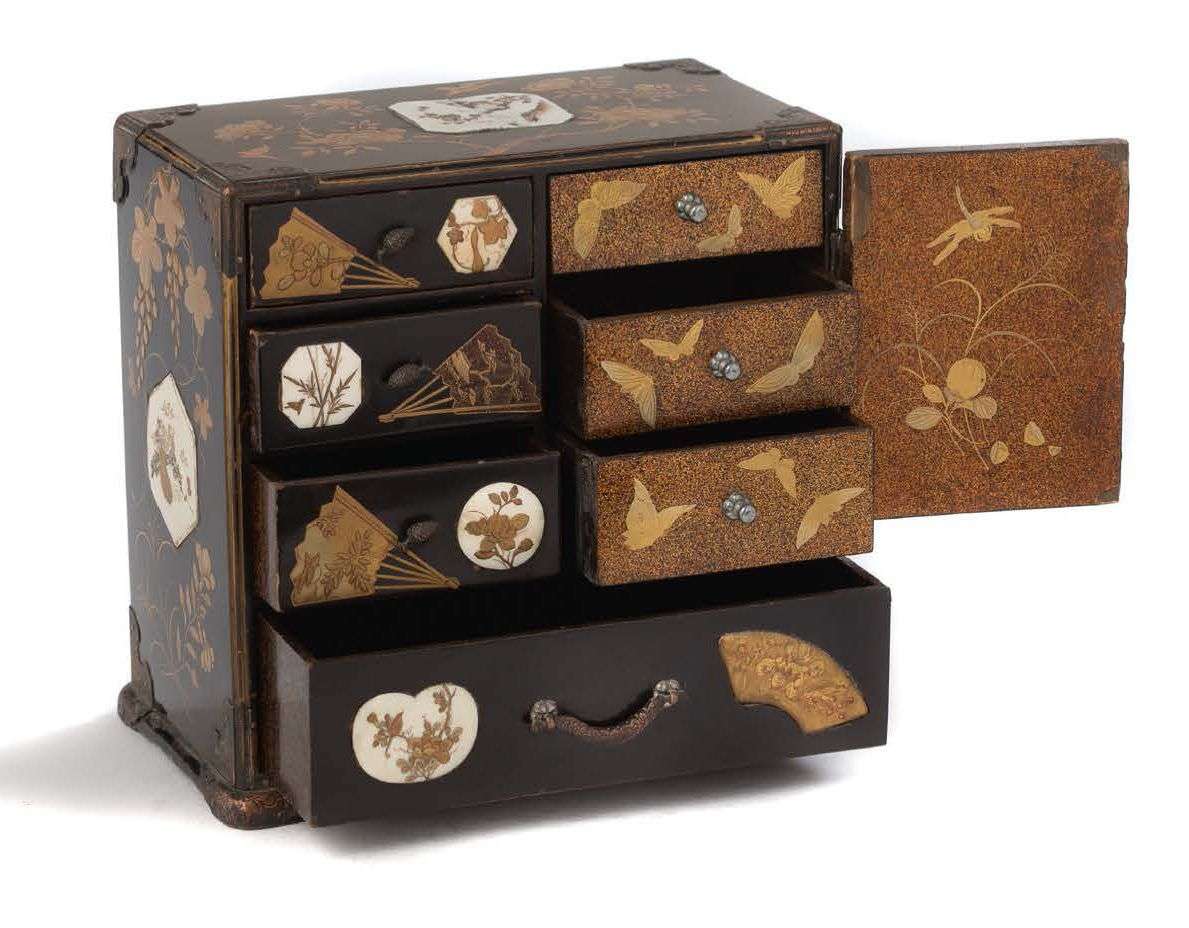 Petit cabinet en bois laqué noir rehaussé, présentant en façade trois petits et un grand tiroir, ainsi qu'une porte, à décor d'éventails laqués or, de médaillons en ivoire orné de motifs floraux, d'oiseaux parmi des fleurs, le sommet et les côtés d'une plaque en céramique à décor floral, incrustés la porte découvrant trois tiroirs à décor de papillons sur fond nashiji, le dos orné de lotus et signé.