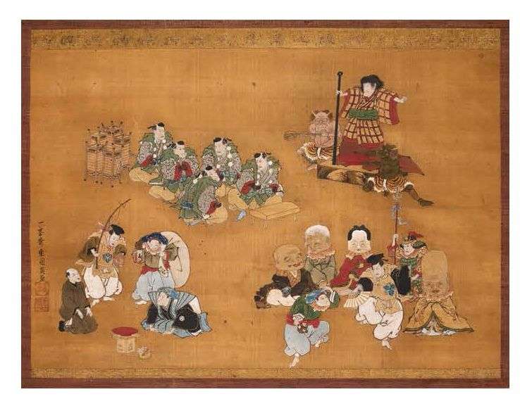 Kakemono en polychromie sur soie représentant plusieurs groupes de personnages ou d'acteurs évoquant différents types, tels dieux du Bonheur, danseurs, samourai... Signé.