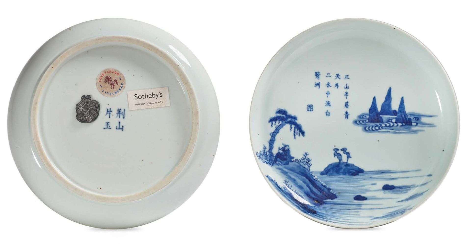 Coupe en porcelaine bleu et blanc céladonné à décor de deux sages sous un pin contemplant deux cigognes blanches perchées sur un rocher aux abords d'une rivière. Au loin trois pics montagneux au milieu des nuages illustrant le poème de Li