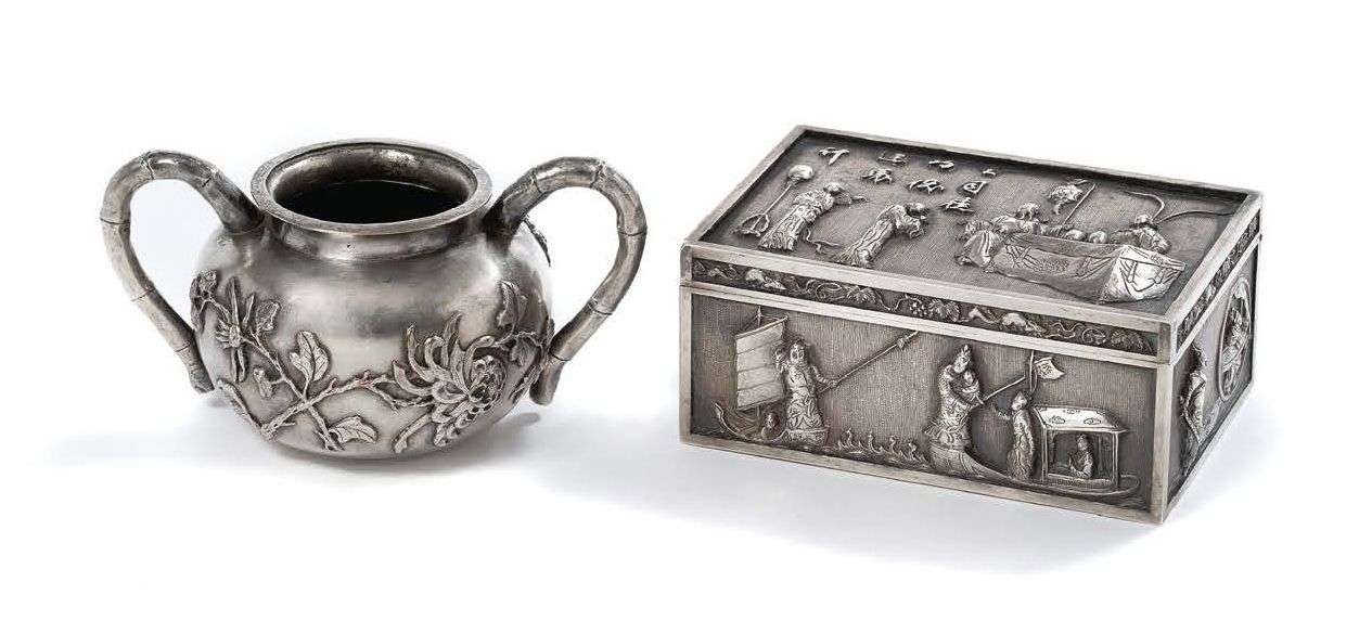 Lot en argent comprenant une boîte en argent et un sucrier en argent (bas-titre 232 g), à décor de fleurs, aux anses reprenant la forme de bambous.