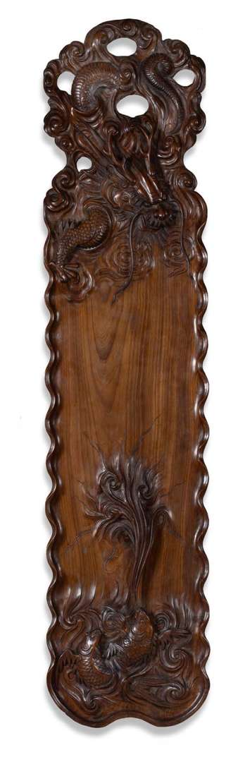 Grand panneau rectangulaire aux bords ondulants en bois, sculpté en haut relief et ajouré d'un dragon parmi des nuages surplombant deux carpes parmi des vagues, l'une crachant un flot d'eau en direction du dragon.