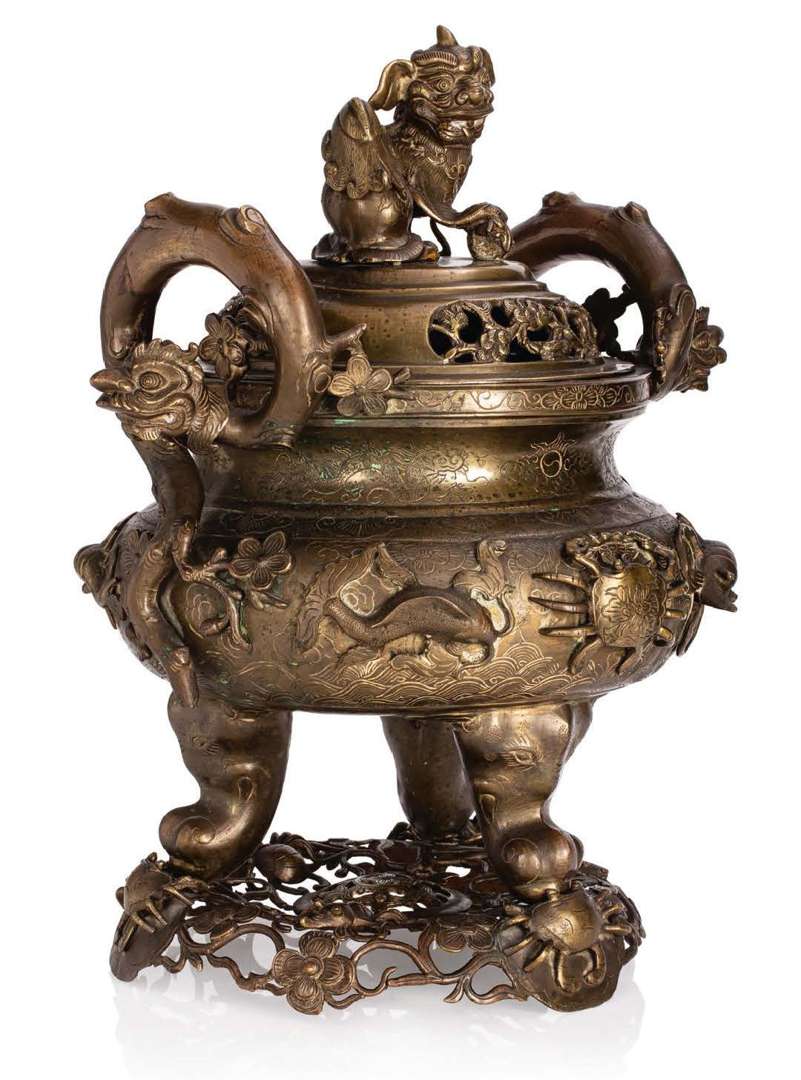 Important brûle-parfum reposant sur trois pieds griffés en bronze, orné de poissons et crustacés en relief, les anses à l'imitation de troncs d'arbres soutenus par deux dragons, un lion bouddhique forme la prise du couvercle.