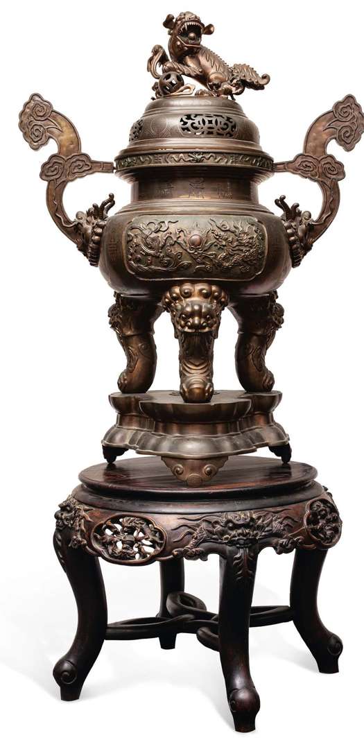 Grand brûle-parfum tripode couvert en bronze en trois parties, de patine médaille et niellé d'argent, à décor en haut relief de deux scènes, dont l'une représentant un dragon et une tortue affrontés autour de la perle sacrée | et l'autre un phénix et Qilin affrontés autour de la perle sacrée, chaque scène parmi des nuages stylisés et emblèmes bouddhiques. Le couvercle à décor ajouré en frises de sapèques stylisées alternant un décor niellé de caractères shous. La prise formant un lion bouddhique et ses deux petits jouant avec une balle. Les deux anses à décor en relief de nuages stylisés, crachées par des têtes de dragons en relief, depuis des cartouches à décor niellé de chauves-souris parmi des nuages. Les pourtours du col et de la panse à décor alterné de caractères et emblèmes bouddhiques. Les trois pieds crachés par des têtes zoomorphes, reposant sur un socle formant nuage stylisé et ajouré en son centre du caractère shou géométrisé.