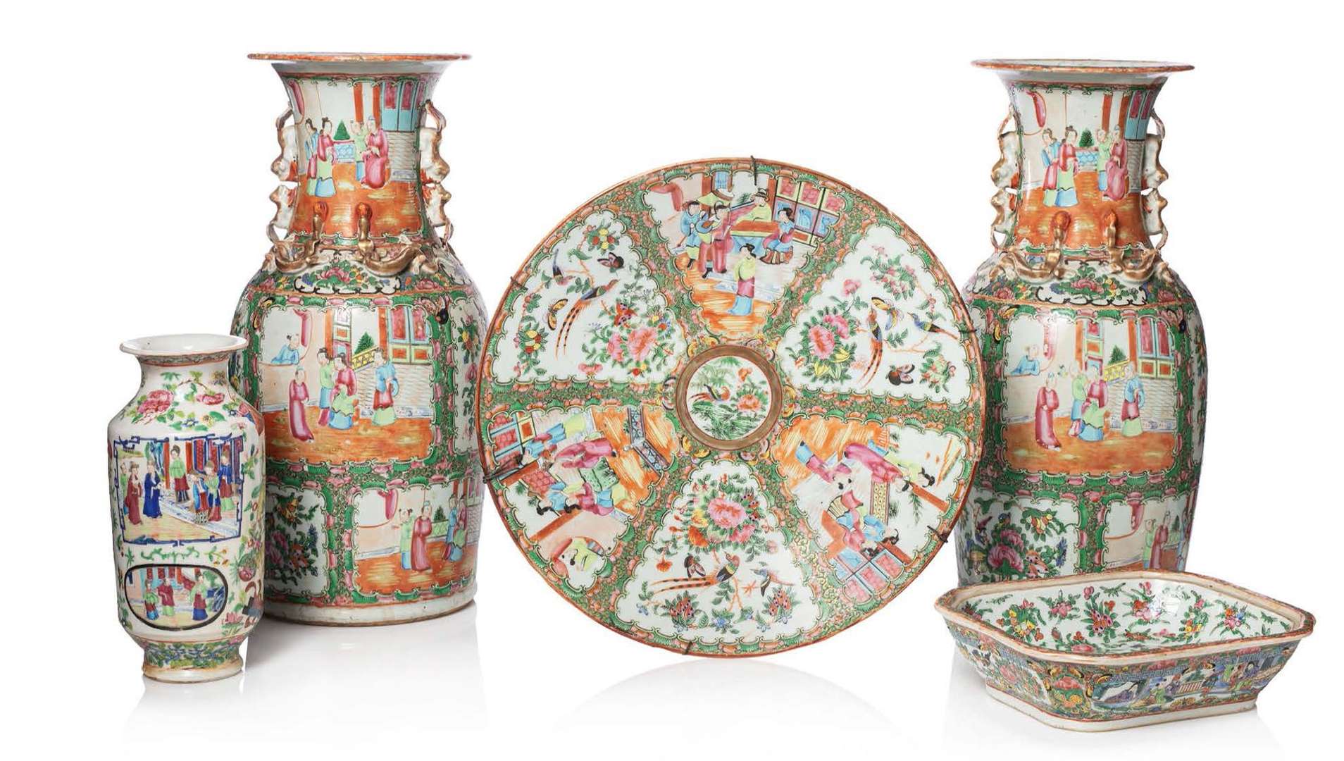 Ensemble de porcelaines de Canton, à décor divers en émaux de la famille rose, de scènes de personnages, oiseaux, fleurs et végétaux, comprenant une paire de vases balustres avec anses formées de chiens de Fô, et dragons salamandres sur le col, un plat, une terrine, et un petit vase balustre.