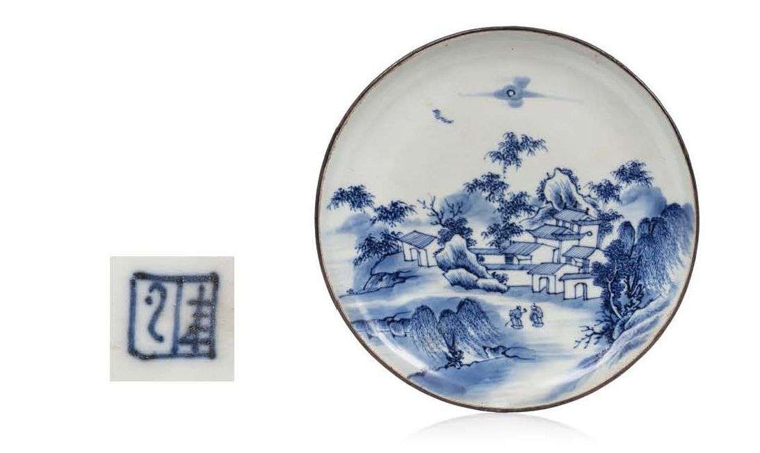 Coupe en porcelaine bleu-blanc, à décor de deux philosophes discutant devant un village, parmi des bambous, pins et saules-pleureurs.