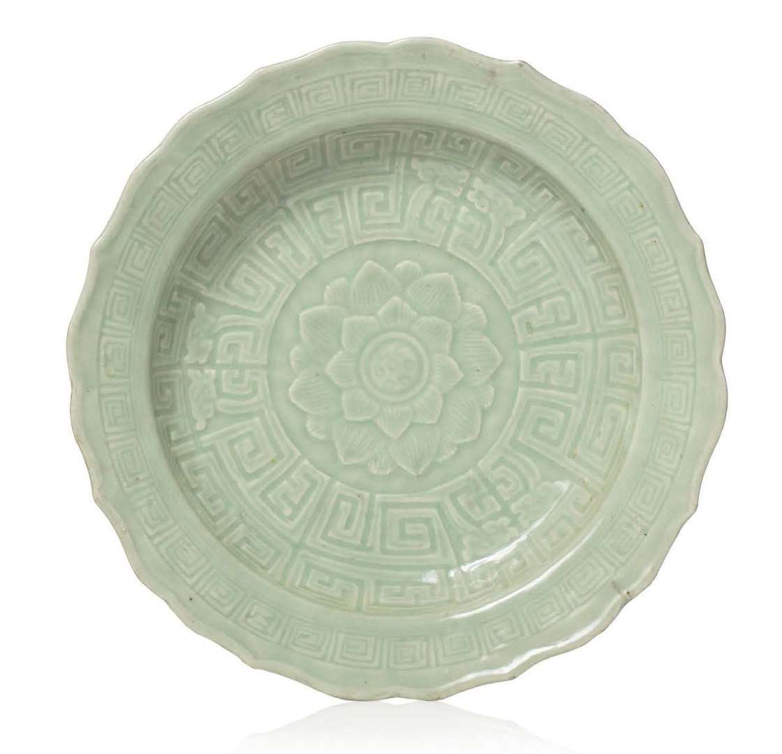 Plat lotiforme en porcelaine et émail céladon, à décor moulé sous couverte d'une fleur de lotus épanouie entourée de grecques stylisées et dragons.