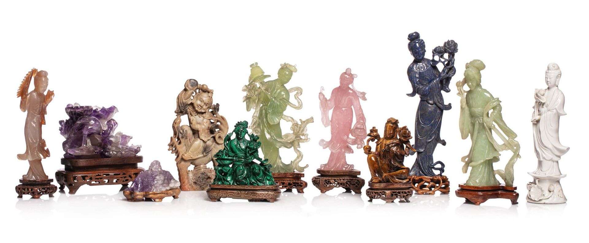 Ensemble comprenant dix pierres dures sculptées, améthyste, oeil de tigre, lapislazuli, quartz, cornaline, agate, serpentine, représentant des divinités féminine et une coupe | et une statuette en blanc de Chine.