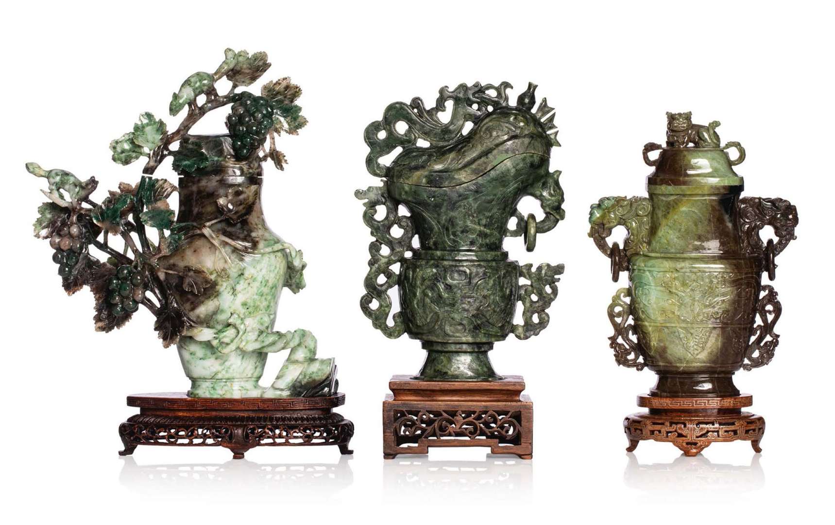 Trois vases en jade de «Henan», dont un Gui couvert archaïsant | un balustre couvert à décor de masques de taotie, anses et prise en forme de lion | et un vase couvert à décor de loirs et feuilles de vignes. Avec socles en bois.
