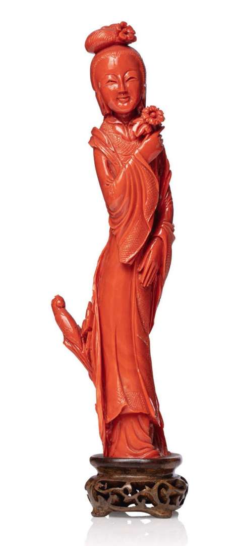 Statuette en corail rouge, représentant une jeune femme souriante tenant une fleur, et à ses côtés un perroquet perché sur un arbuste.