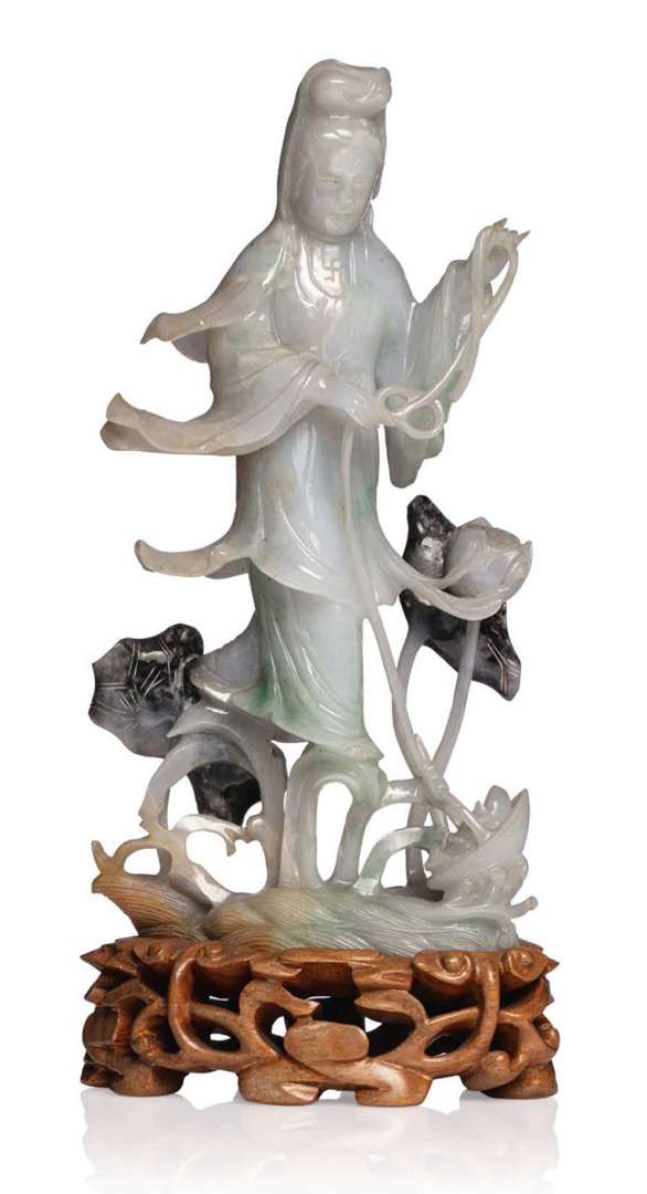Statuette en jadéite de couleur absinthe partiellement infusée de vert et de rouille, représentant une divinité féminine remontant un panier où se trouve un poisson, parmi des flots et lotus.