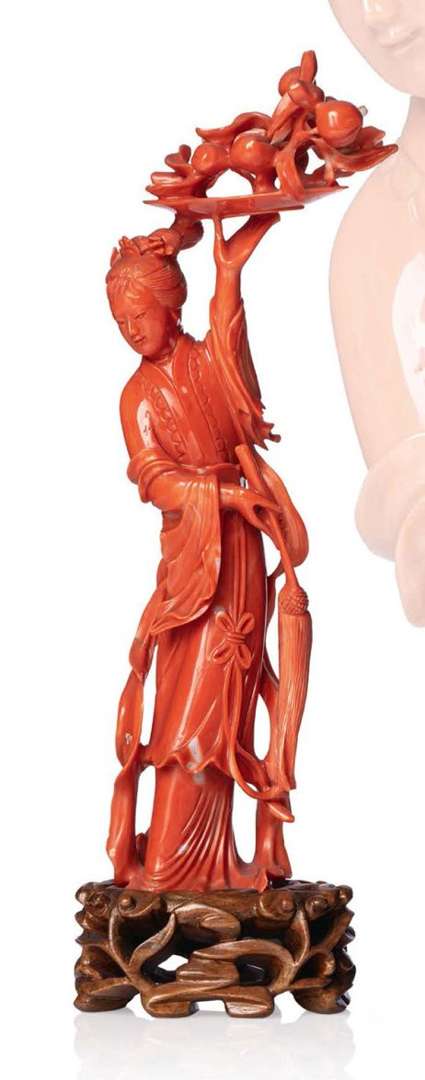 Statuette en corail rouge, représentant une jeune femme tenant une coupe contenant des pêches de longévité, et un chasse-mouche.