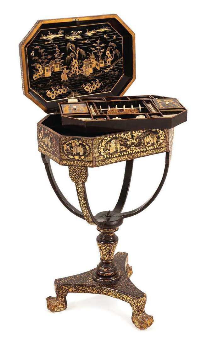 Boîte à ouvrage rectangulaire reposant sur un piètement de style baroque, à décor en laque rouge et or sur fond noir d'une cité lacustre animée de personnages, l'intérieur laqué or et noir représentant des scènes de divertissements. Avec nécessaire de couture en ivoire.