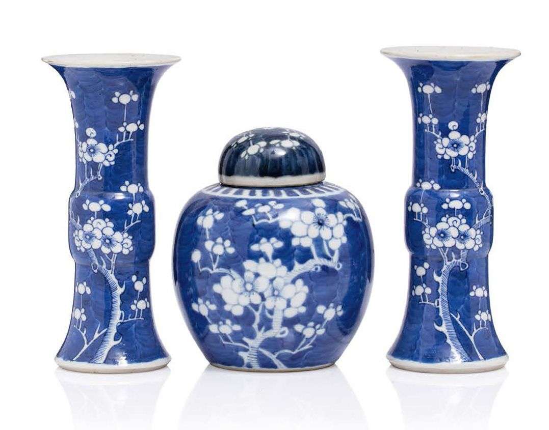 Lot comprenant une paire de vases cornets, et un pot à gingembre, en porcelaine à décor bleu blanc de fleurs de prunus.