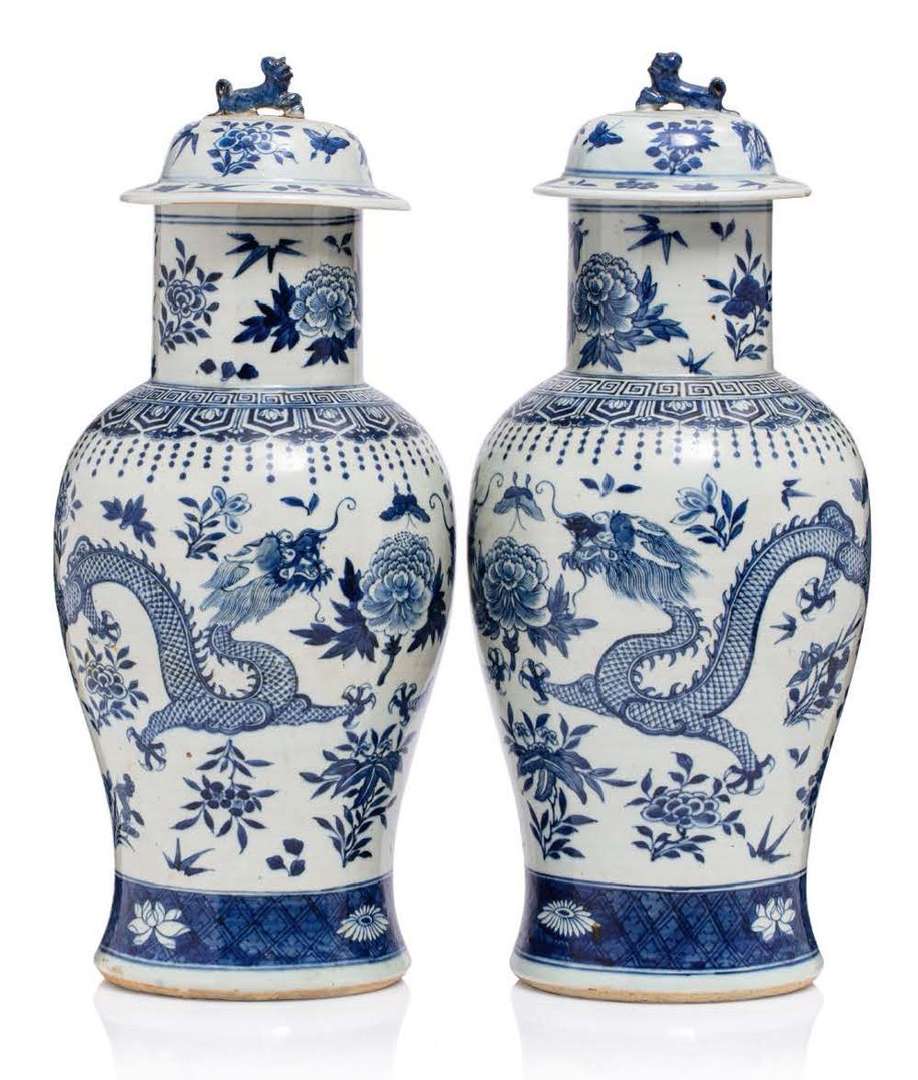 Paire de vases couverts en porcelaine bleu-blanc à décor de dragons parmi fleurs et feuillages.