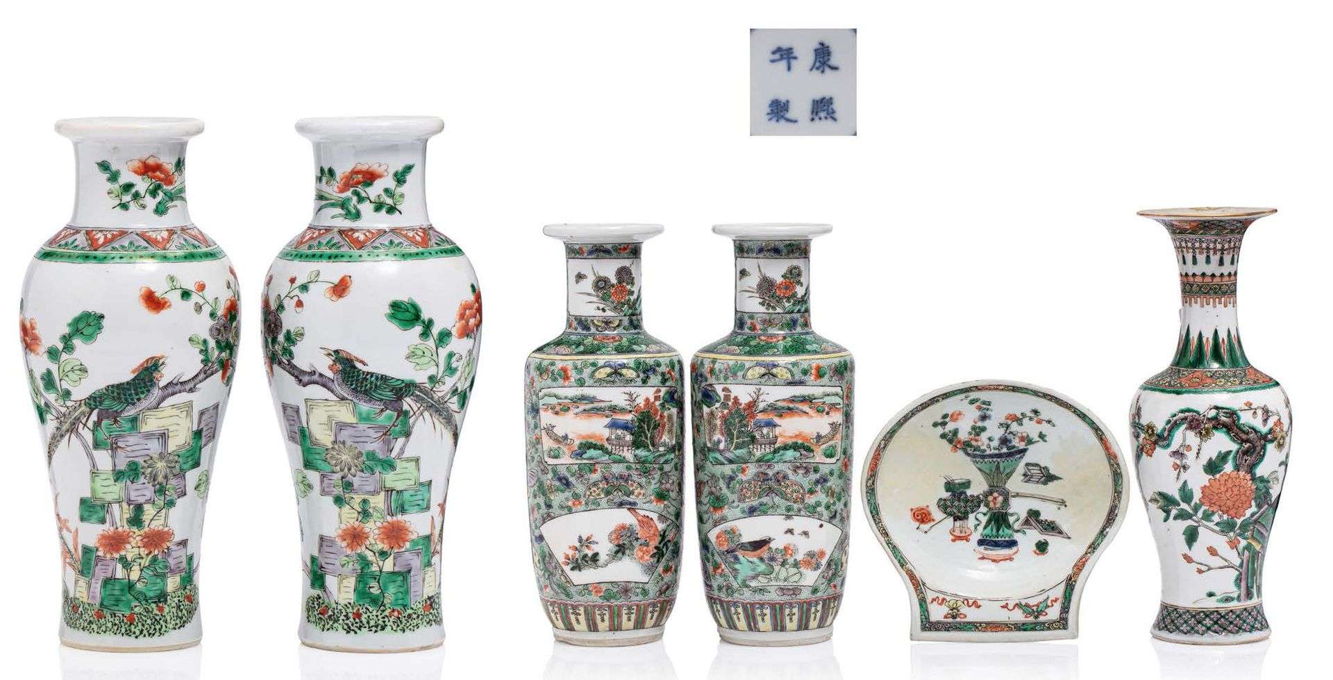 Lot de porcelaines et émaux de la famille verte comprenant, une paire de vases rouleaux en porcelaine et émaux de la famille verte, à décor en médaillons de scènes de personnages, parmi fleurs, papillons et rinceaux | une paire de vases balustres, à décor de faisans sur des cerisiers en fleurs | un vase balustre d'oiseaux fohangs et pivoines | une coupe en forme de coquillage en porcelaine et émaux de la famille verte, à décor d'objets mobiliers | une coupe dans le style wucai à décor d'oiseaux fohangs et dragons parmi des nuages.