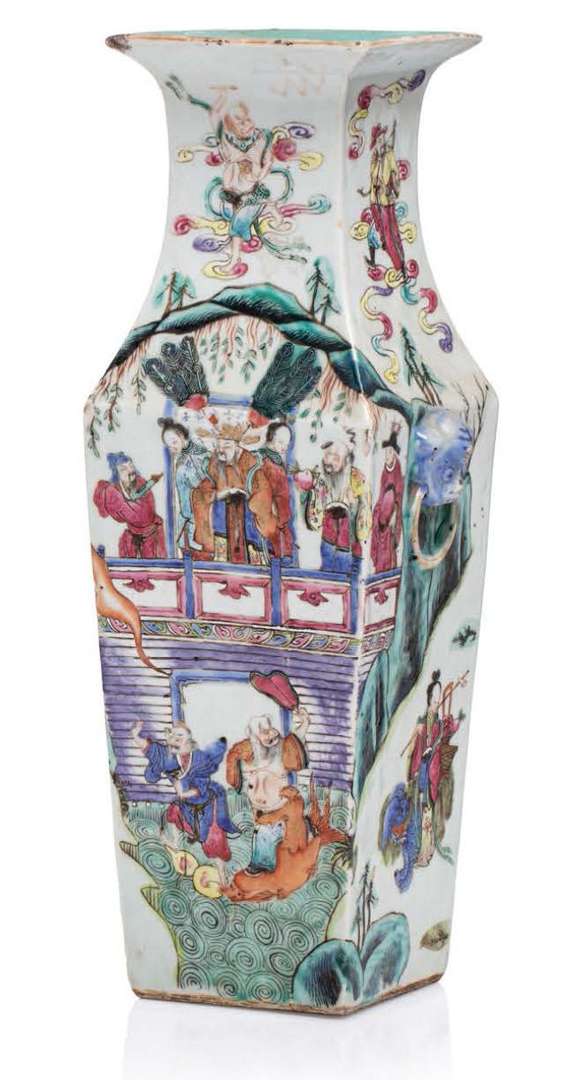 Vase de forme quadrangulaire en porcelaine et émaux de style famille rose, à décor d'immortels évoluant aux abords d'un palais, et dignitaires taoïstes festoyant, des têtes de lions en relief complétant le décor.