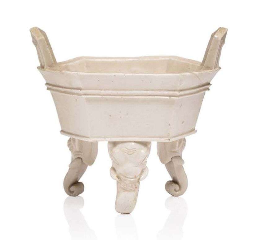 Coupe hexagonale, reposant sur trois têtes d'éléphant en porcelaine blanc de Chine.