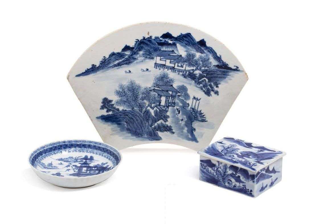 Lot de porcelaines bleu-blanc comprenant un panneau en forme d'éventail à décor d'une cité lacustre, une coupe à décor de pagodons sur les bords d'une rivière, et une petite boîte couverte à motifs de village.
